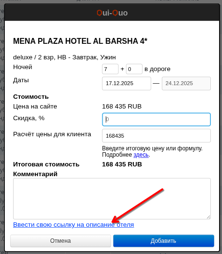 2. Если хочется, чтобы турист читал отзывы на конкретной странице, где нужно вам, то нажимаем на "карандашик", а не на галочку на сайте ТО или агрегатора, вставляем свою ссылку на описание отеля и добавляем тур.