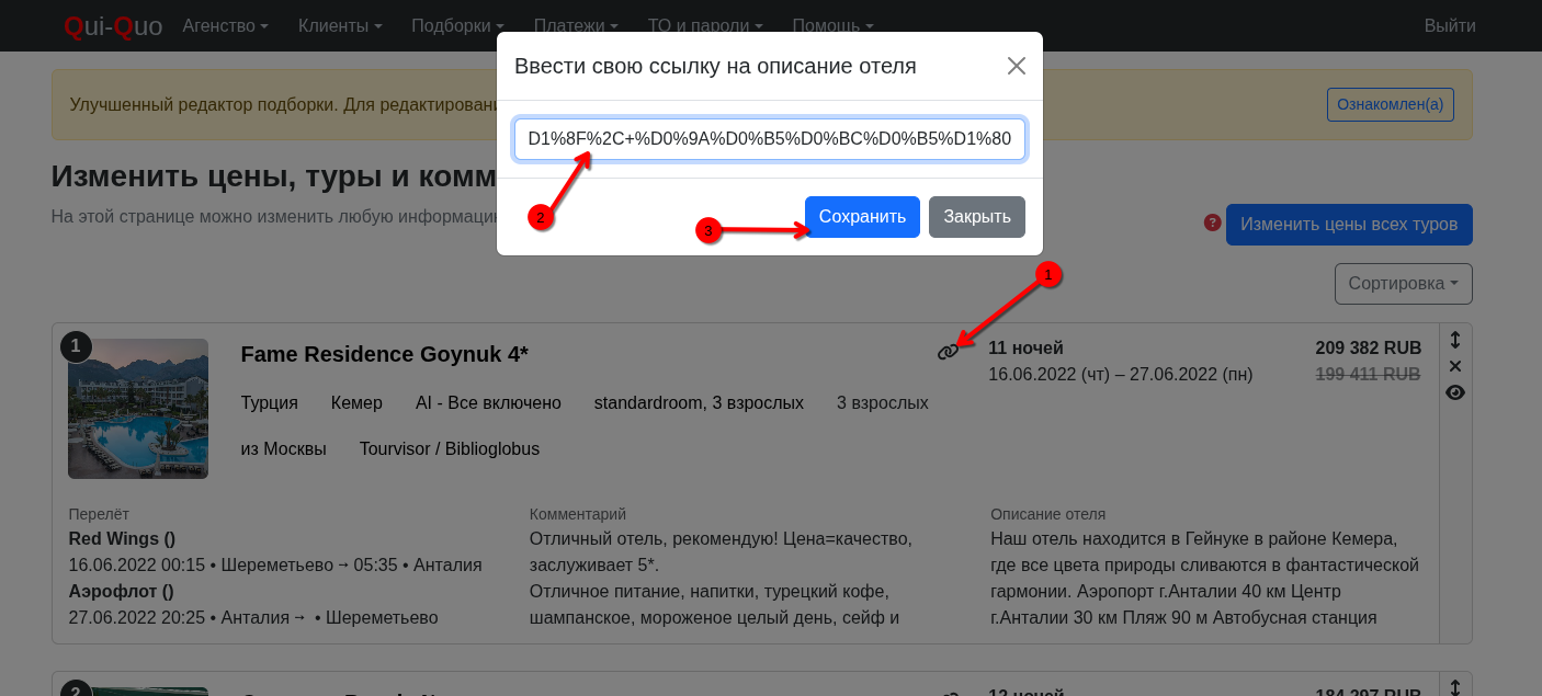 Потом справа от названия отеля нажмите на соответствующий значок (1), вставьте свою ссылку (2) и сохраните (3)