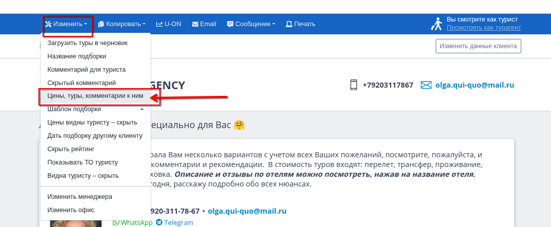 В готовой подборке это тоже можно сделать. Для этого на подборке нажимаем "Изменить -- Цены, туры и комментарии к ним".