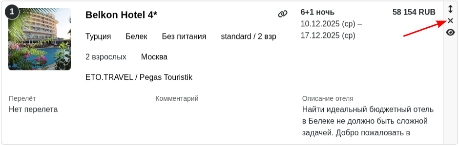 Если вы хотите не скрыть, а изменить цену, то нужно нажать "Изменить -- Цены туры и комментарии к ним". "Крестиком" можно удалить ненужные отели из подборки,