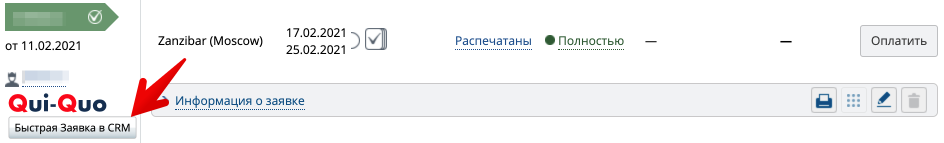 На сайтах туроператоров есть кнопка «Быстрая Заявка в CRM». Эта кнопка позволит не только быстрее создавать заявку в MAG.Travel, но и извлечёт всю информацию по туру. Больше не придётся вручную вводить данные об отеле, перелёте, страховке и трансфере в MAG.Travel или копировать их со страницы заявки на сайте ТО. С помощью Кви-Кво вы сможете легко и просто перенести заявку в MAG.Travel. Быстрая заявка убирает рутину из вашей работы, риск сделать ошибку уменьшается.