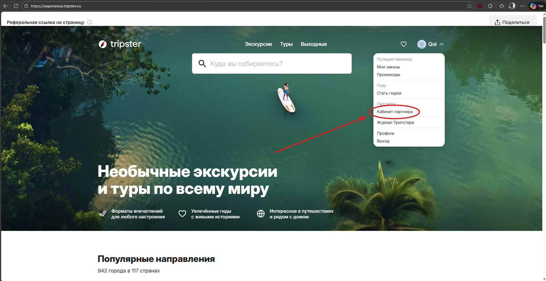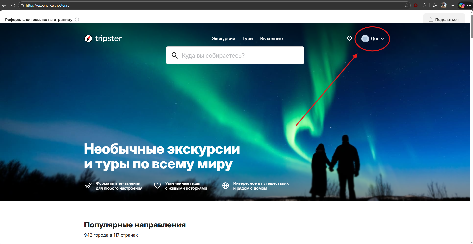 Шаг 1. Зайдите на сайт experience.tripster.ru, авторизируйтесь и нажмите на иконку профиля в правом верхнем углу.