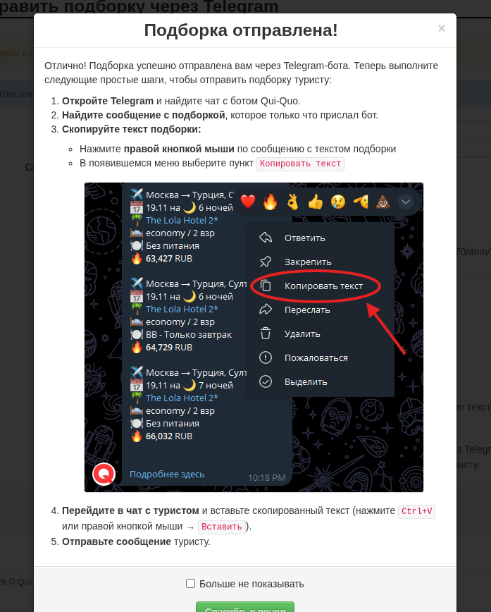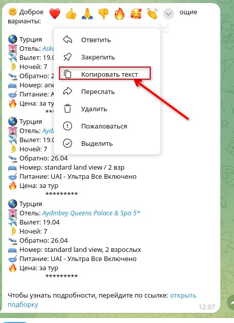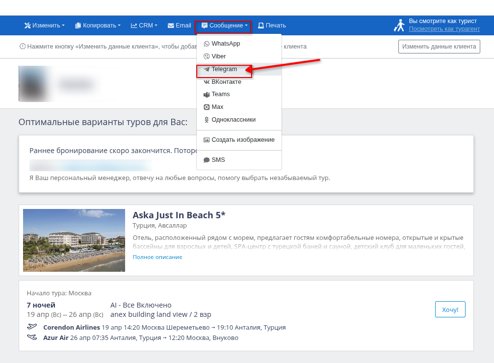 8. Открываем чат с туристом и вставляем скопированный текст в сообщение, отправляем подборку туристу. Названия отелей в сообщении будут кликабельными.