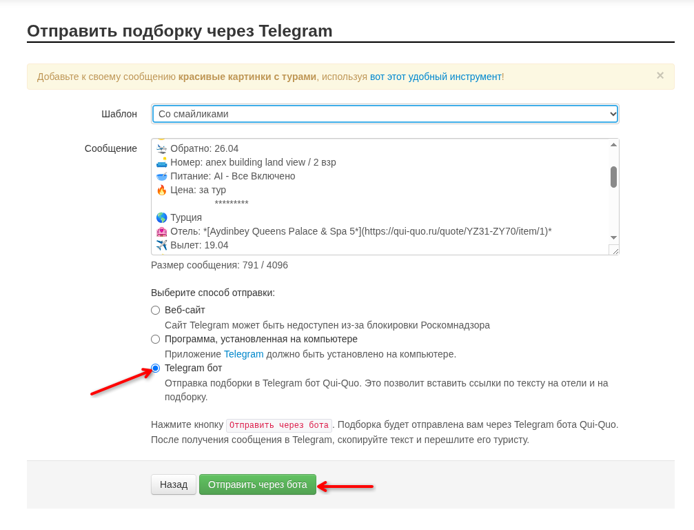 При отправке подборки в Телеграм, ваши туристы получают сообщение, в котором переходят по ссылке на веб-страницу подборки, смотрят там отели. Можно сделать так, что названия отелей будут кликабельными прямо в самом сообщении. Для этого требуется подключить бота.