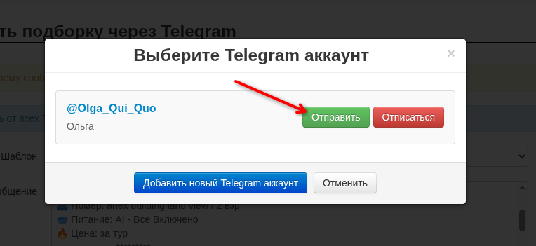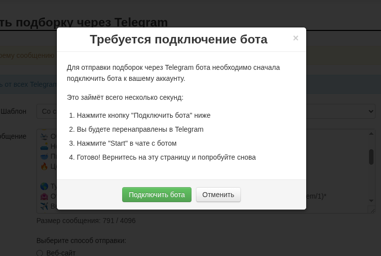 5. После успешной подписки возвращаемся на страницу отправки подборки и отправляем подборку через бота (пункт 2). Откроется окно, где нужно нажать "Отправить"