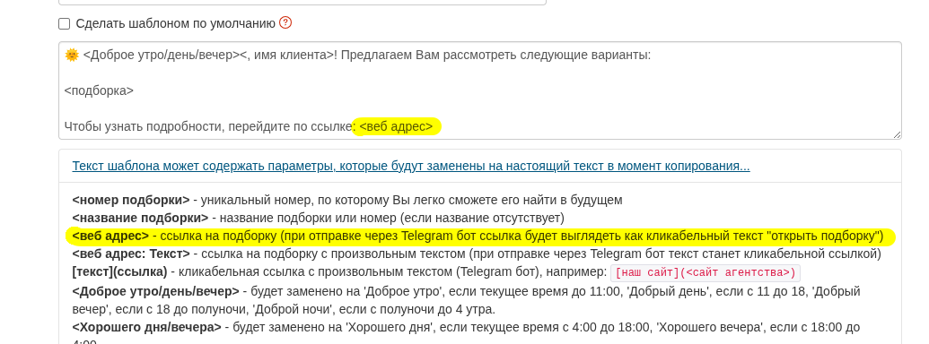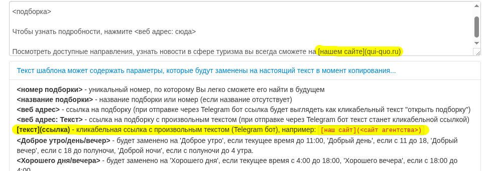 Если вам захочется вместо "открыть подборку" написать какой-то свой текст, то замените в шаблоне параметр <веб адрес> на параметр <веб адрес: Текст>  и замените слово Текст на свой вариант. В примере ниже, например, слово Текст заменено на слово "сюда"