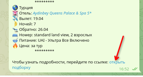 Помимо названий отелей при отправке через бота в Телеграм в сообщении появляется спрятанная в текст "открыть подборку" ссылка на веб-страницу подборки.
