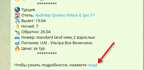 И при отправке через бота,соответственно, в сообщении ссылка будет спрятана в слово "сюда" как на картинке ниже: