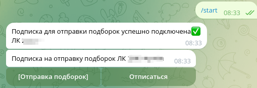 В вашем чате с ботом появится сообщение об успешной подписке на отправку подборок