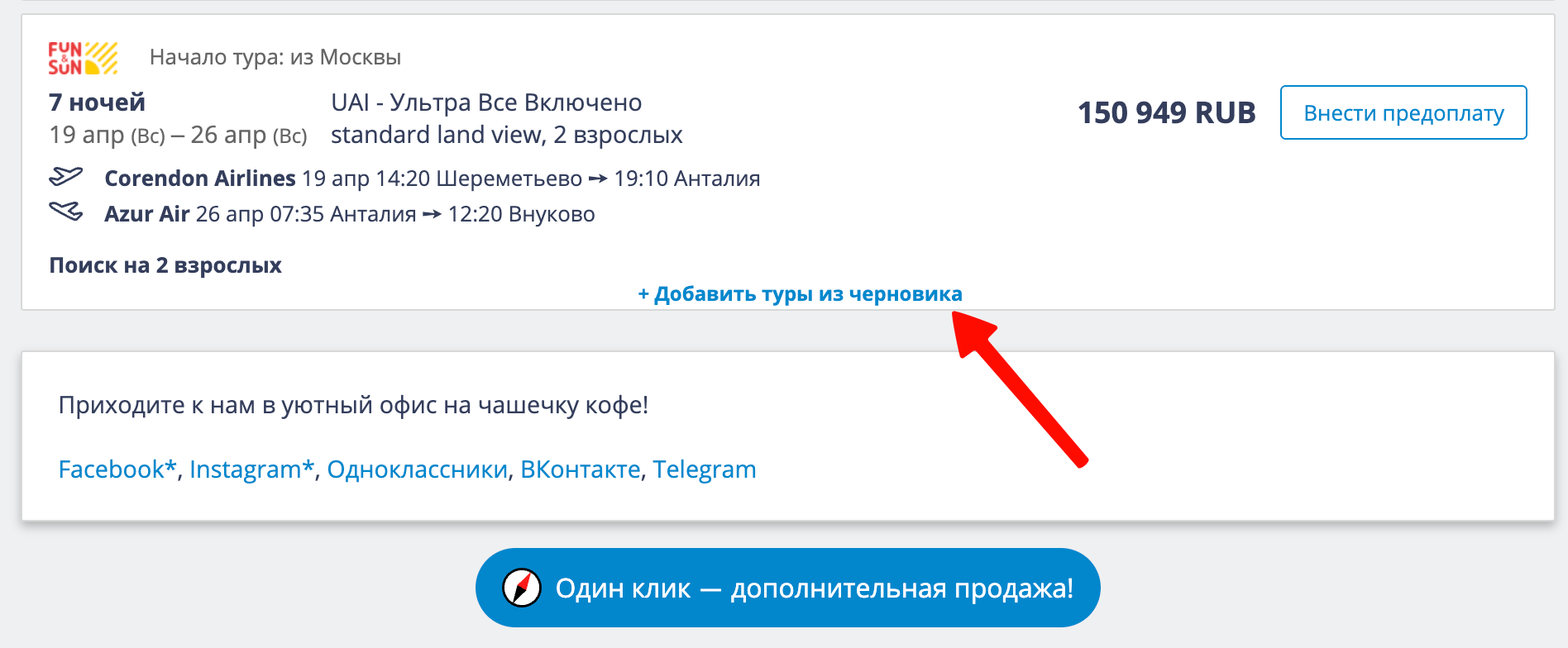 Когда экскурсии выбраны путём нажатия на галочку Qui-Quo рядом с ними, нужно вернуться на вкладку с подборкой, навести мышку на тур, под ним появится ссылка "+ Добавить туры из черновика", надо нажать на неё: