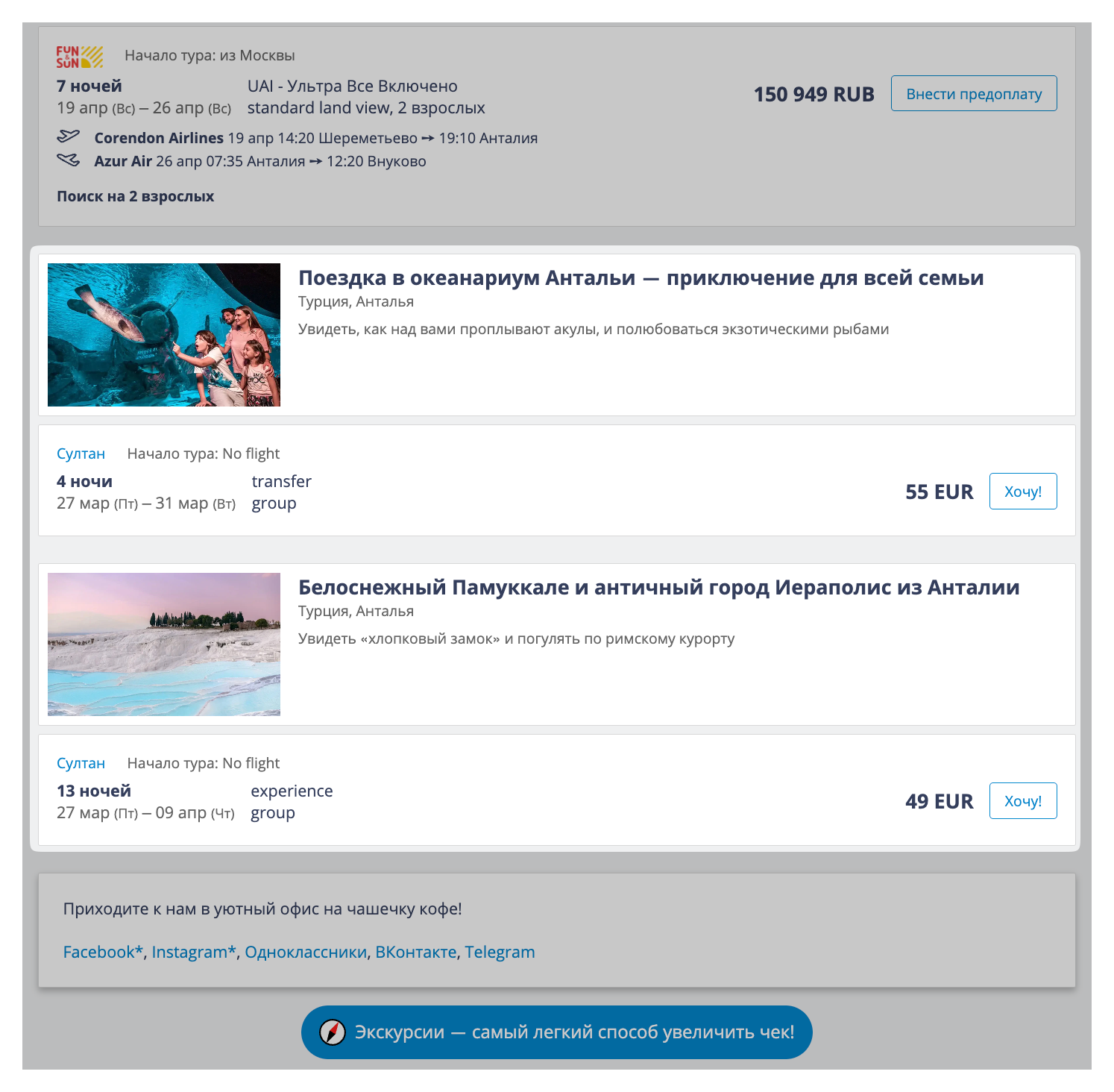 1. Вы можете добавить в обычную подборку с турами несколько вариантов экскурсий, которые посчитаете наиболее подходящими для вашего клиента. Турист выберет и попросит вас забронировать.