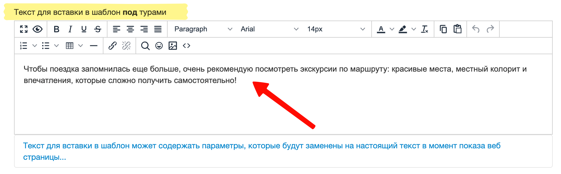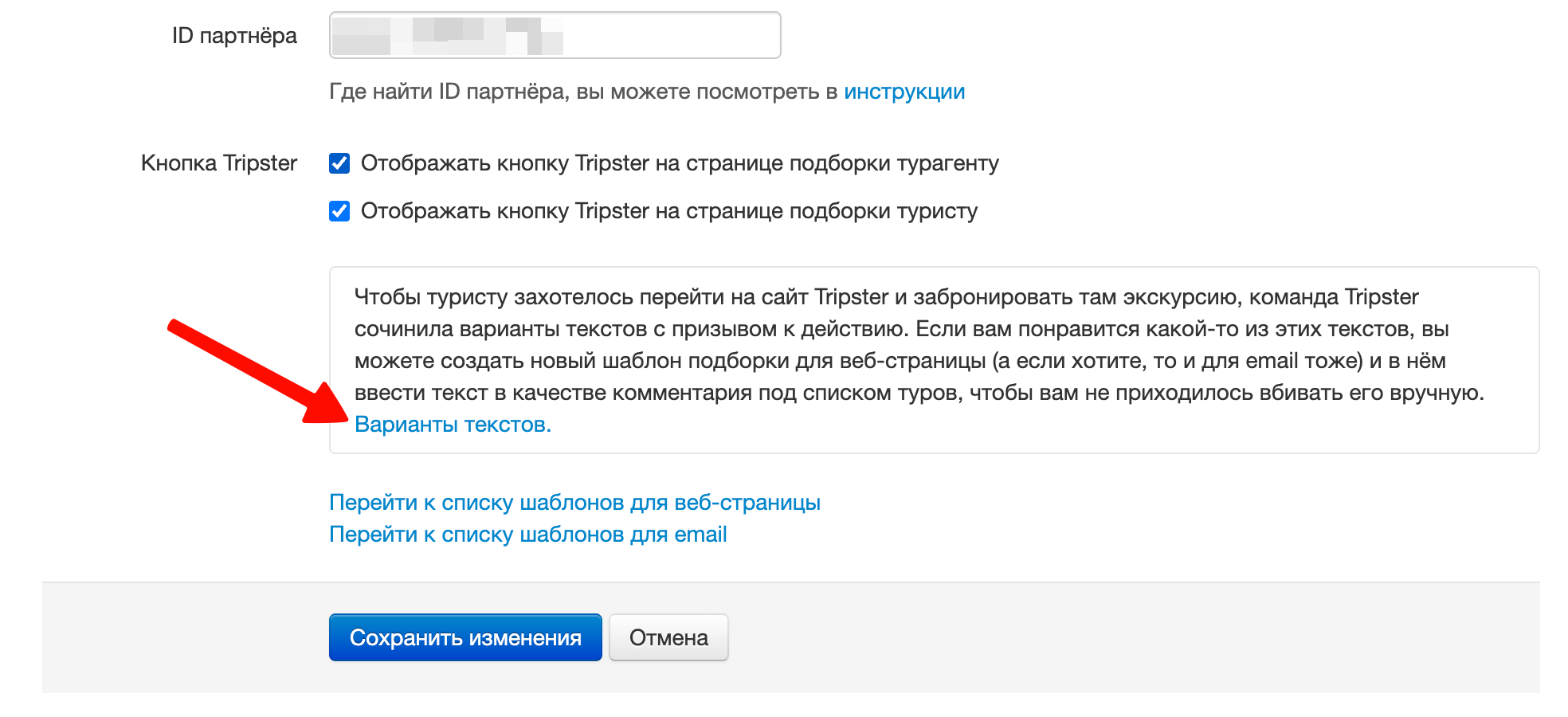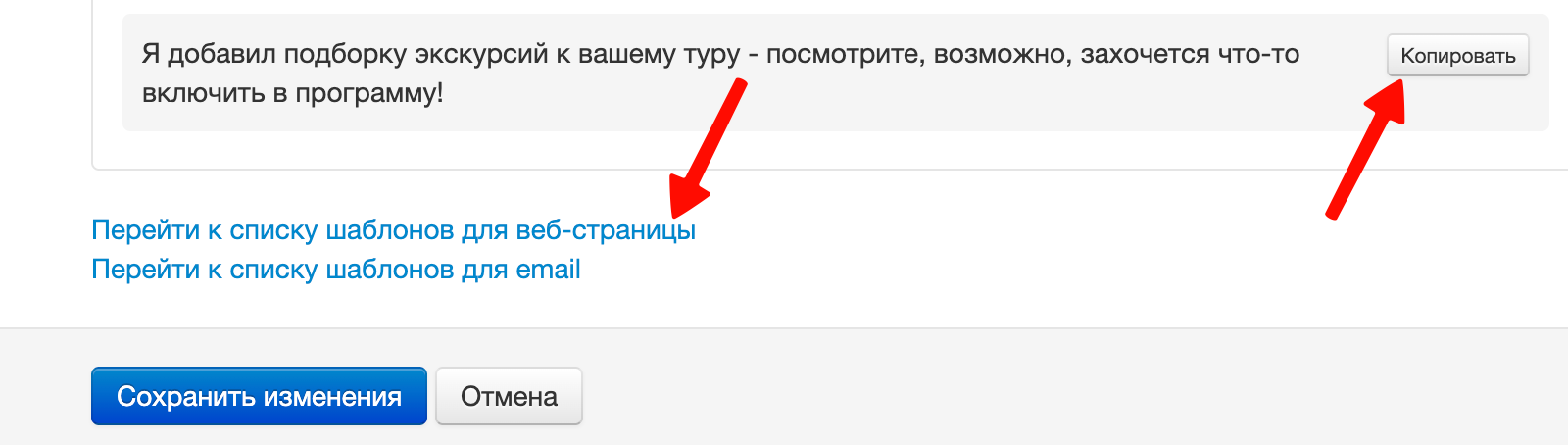 Рекомендуем создать шаблон с текстом, призывающим туриста пойти на Tripster и выбрать экскурсию. Если вам понравился один из вариантов текста, сочинённых командой Tripster, нажмите кнопку "Копировать" напротив него, текст будет помещён в буфер обмена, потом кликните по ссылке "Перейти к списку шаблонов для веб-страницы", чтобы открыть шаблоны: