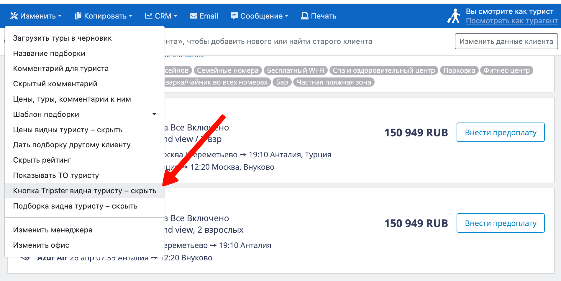 Если у вас включена галочка, показывающая кнопку Tripster туристу на всех подборках, но на какой-то конкретной подборке вы хотите её скрыть, это можно сделать, выбрав соответствующий пункт в меню: