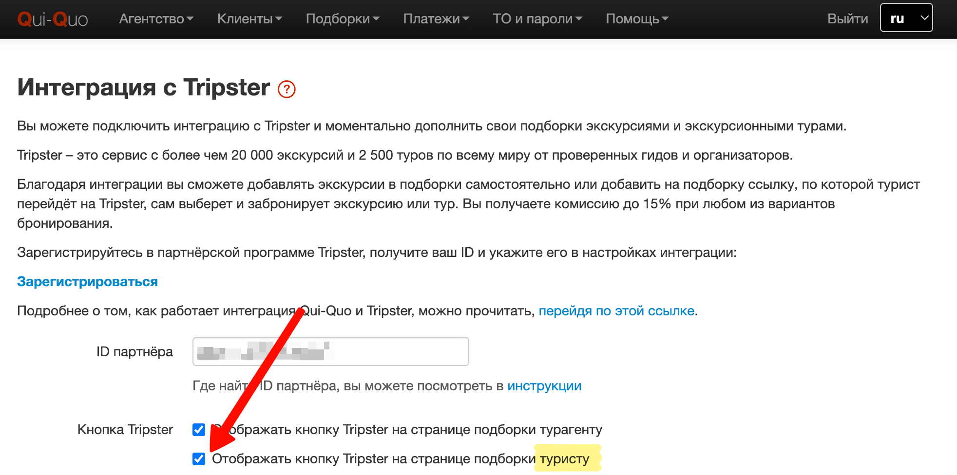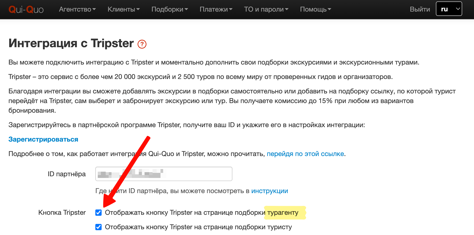Откройте настройки интеграции Qui-Quo с Tripster, в личном кабинете в меню выбрав Агентство -> Интеграция -> Tripster.